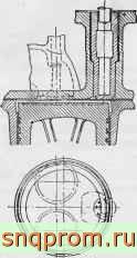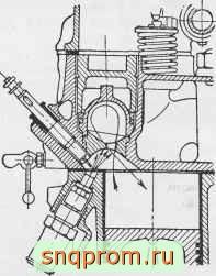 В конце хода сжа1ия впрыскивание топлива вследствие направления струи к соединительному отверстию и перетекания заряда увлекается в камеру. Вспышка в последней создает перепад давления, вызывающий интенсивное перетекание из камеры в надпоршневое пространство, форма которого способствует образованию закономерного кругового движения в каждой из выемок под клапанами, что улучшает смесеобразование.
